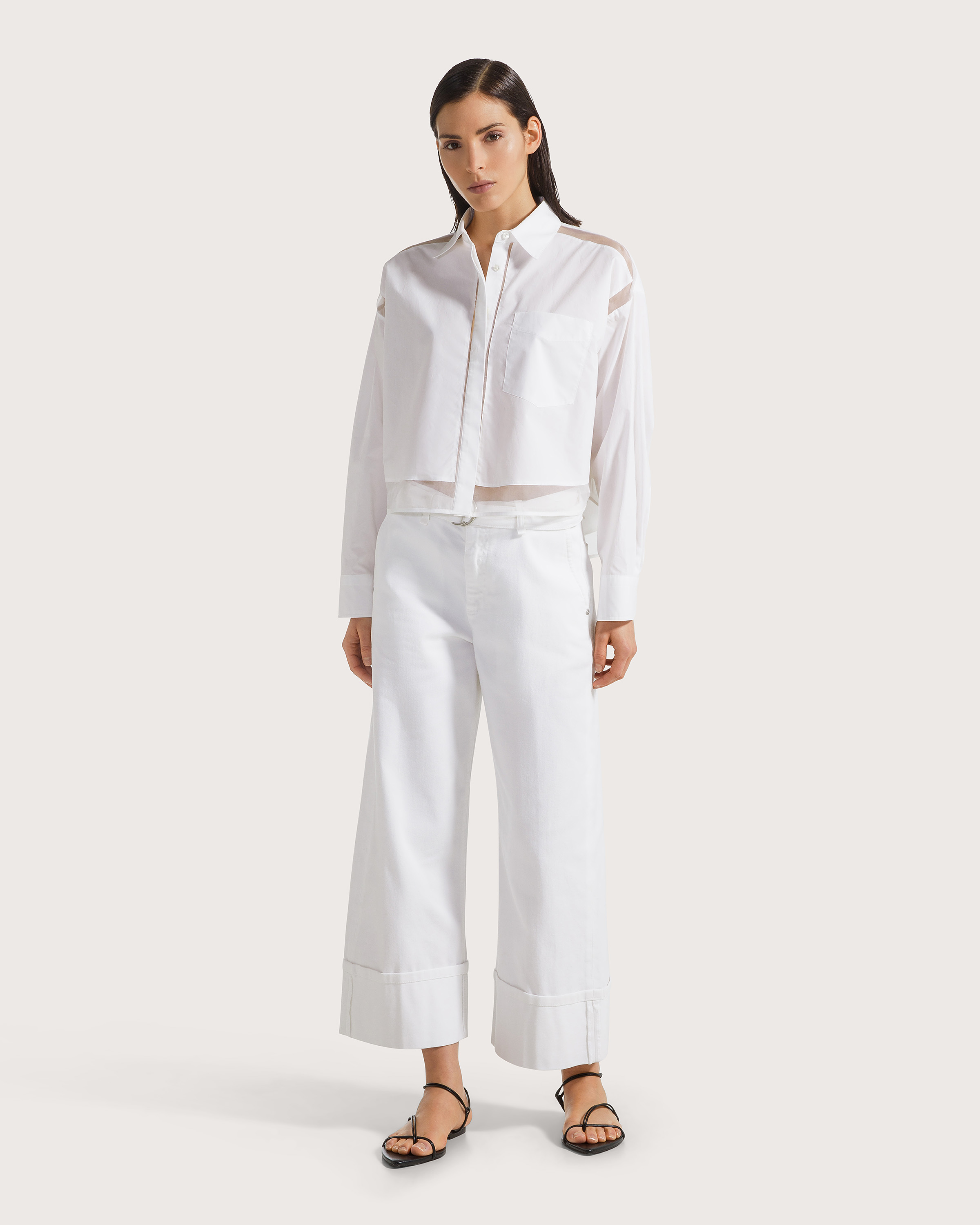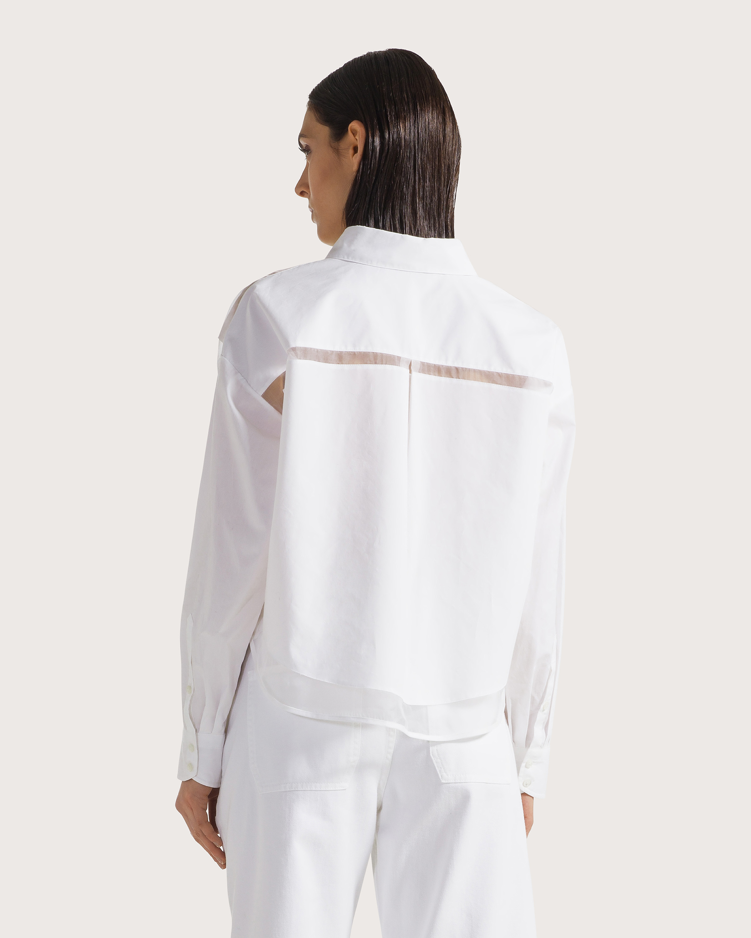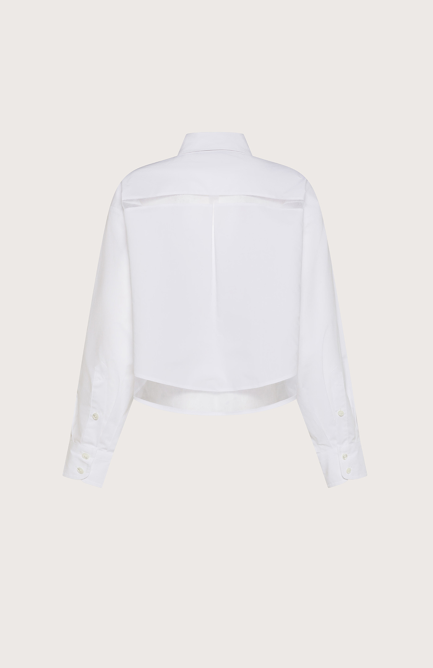 Biela košeľa s moderným, skráteným strihom redefinuje klasiku. Čisté línie dopĺňa jemne transparentný spodný lem, ktorý dodáva modelu ľahkosť a sofistikovaný rozmer. Precízne spracovanie a ostrý golier podčiarkujú minimalistický charakter. Perfektná k vysokému pásu aj vrstveniu – nadčasový kúsok s módnym twistom.