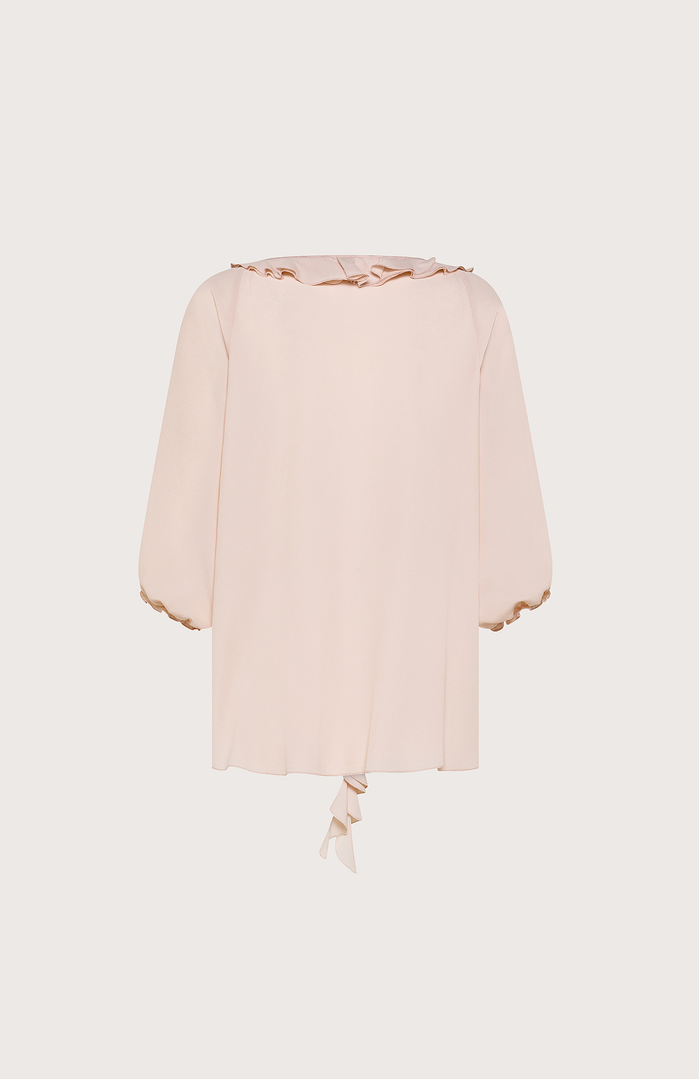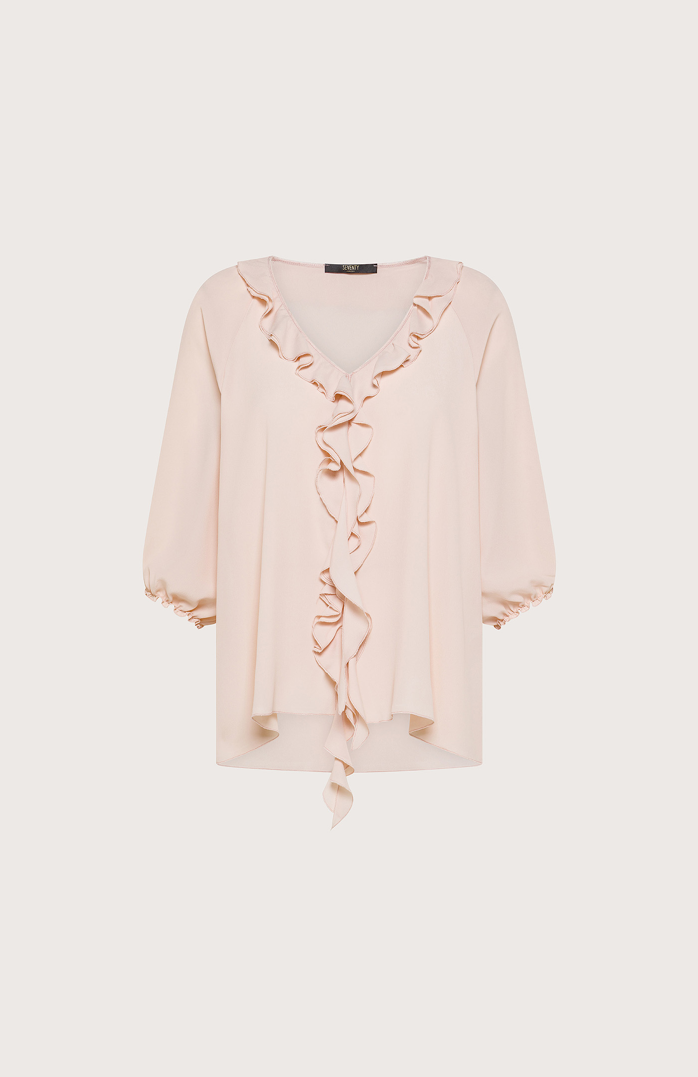 Vzdušná blúzka v jemnom pudrovom odtieni, zdobená elegantnými volánmi po výstrihu aj vpredu. Ľahko sa nesie, krásne splýva a pôsobí romanticky aj sofistikovane. Mäkké trojštvrťové rukávy dodávajú ženskosť a vytvárajú nadčasový, jemne francúzsky look. Zloženie: 65% Acetát 35% Hodváb