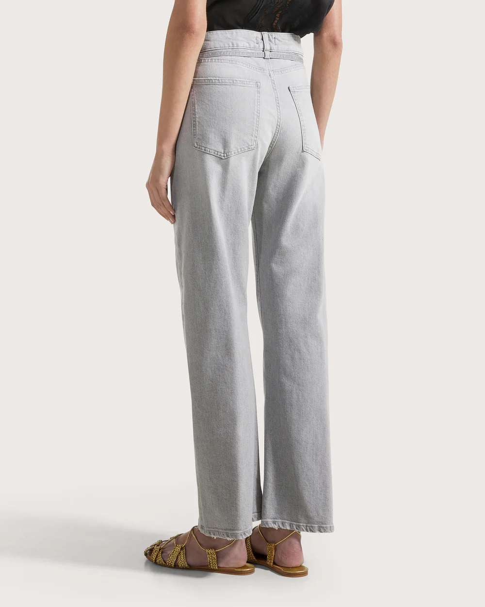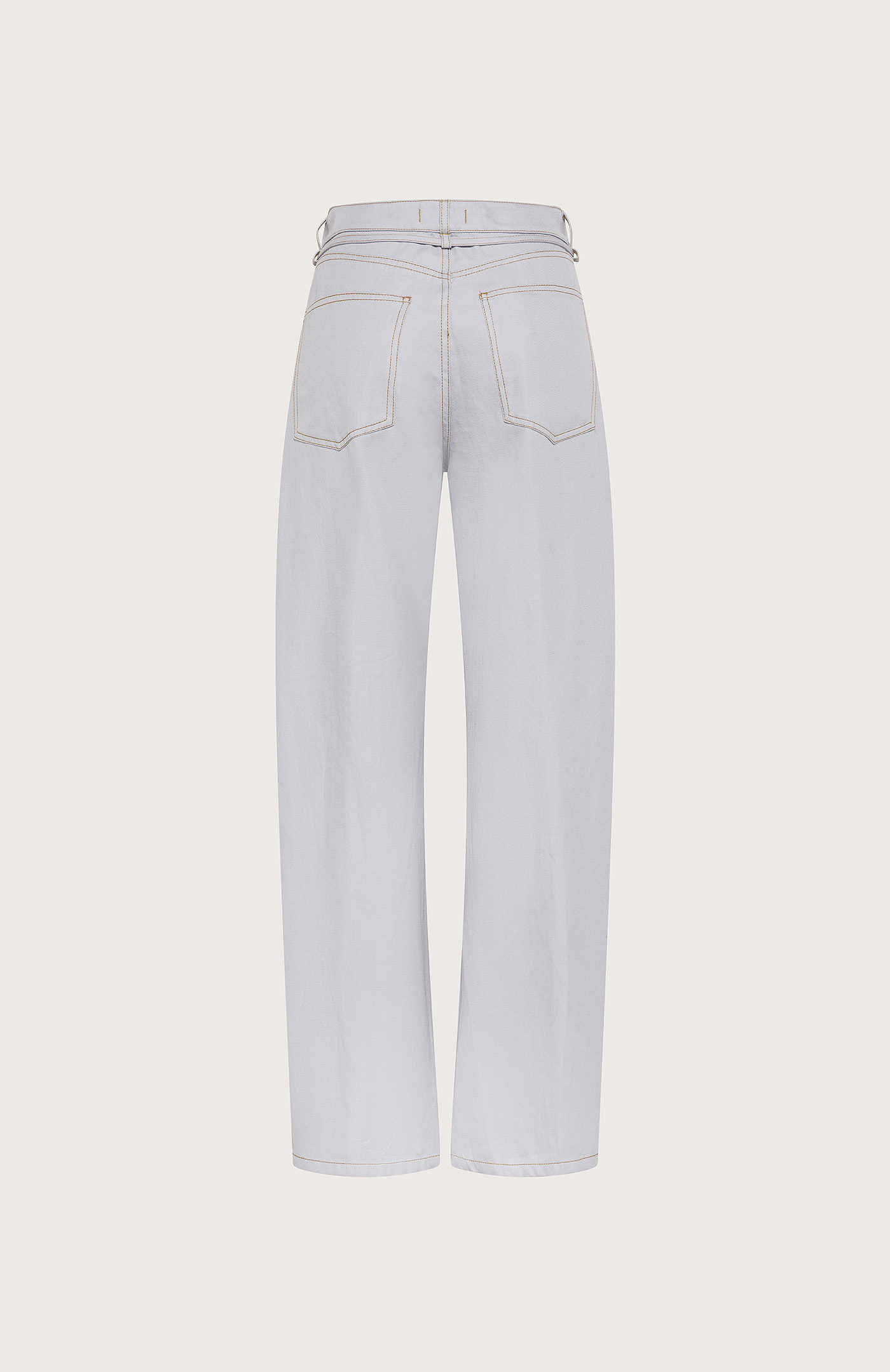 Svetlé denimové nohavice s vysokým pásom a priloženým tenkým opaskom šikovne formujú siluetu. Rovná, mierne širšia línia pôsobí moderne a veľmi čisto. Kontrastné prešívanie dodáva eleganciu a vytvára nadčasový kúsok, ktorý skvele ladí s košeľami aj jednoduchými topmi.