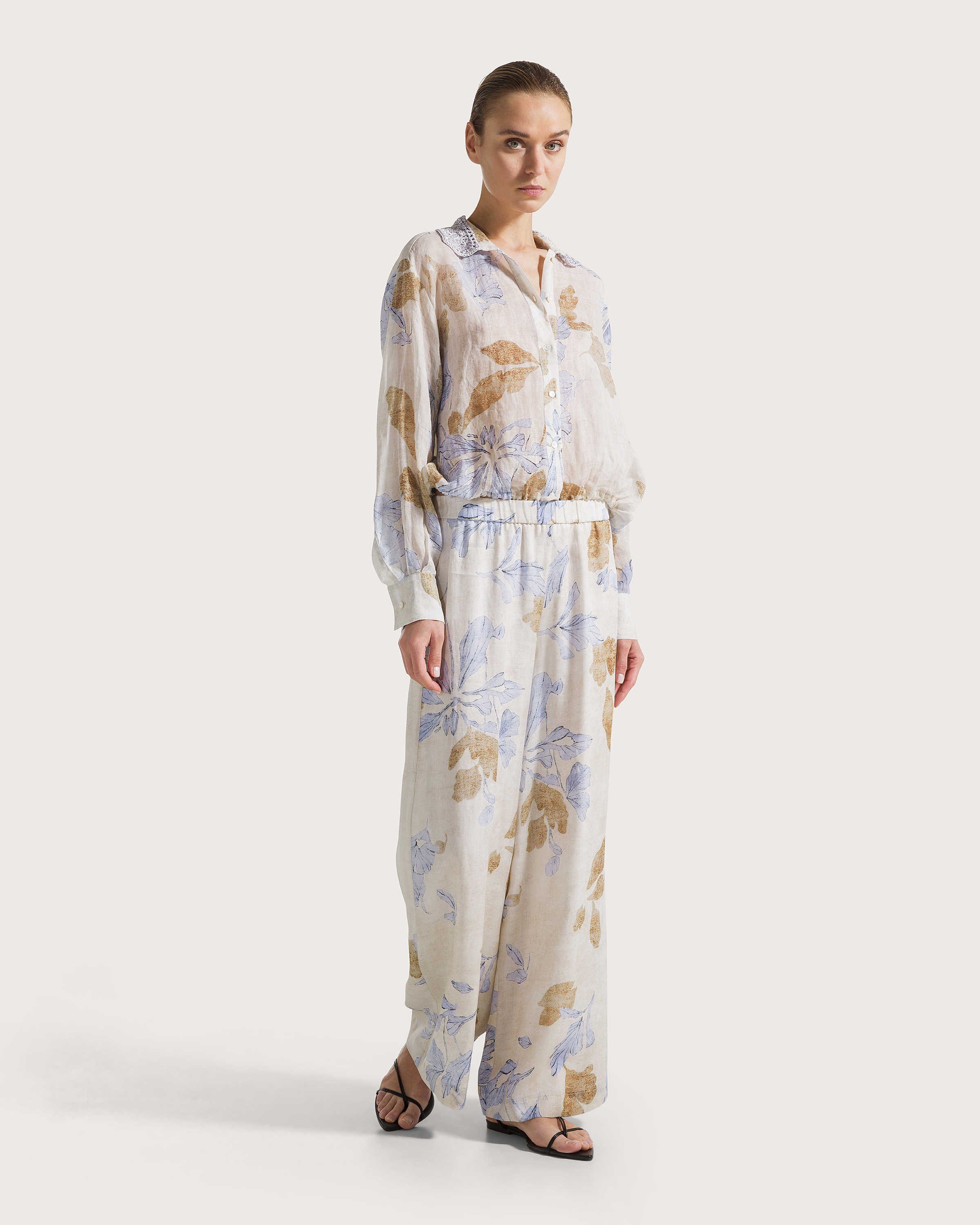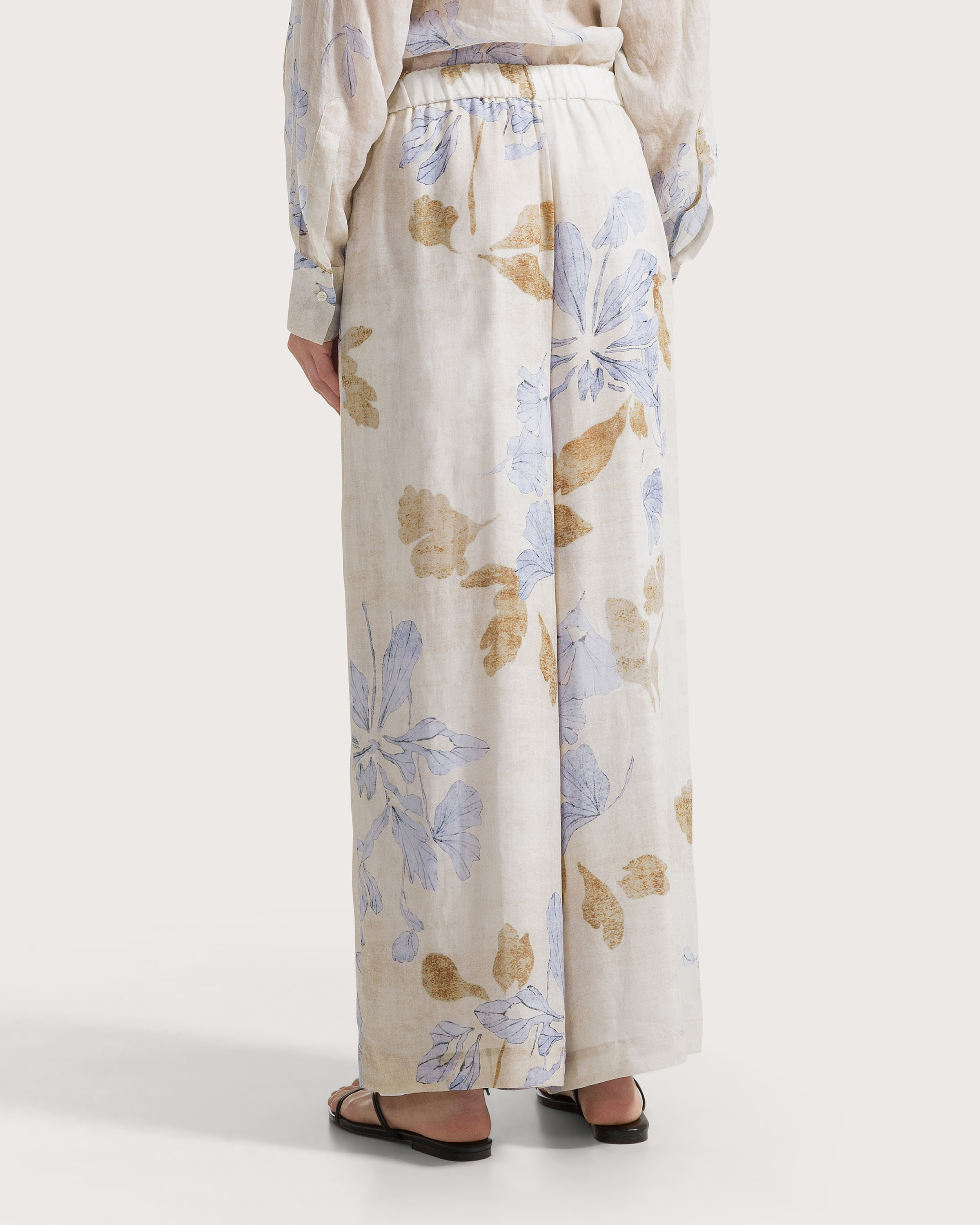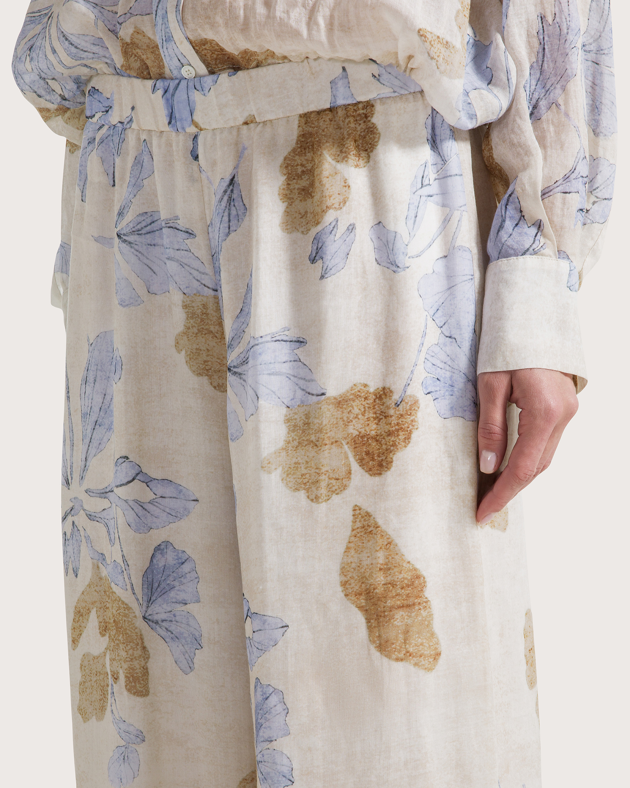 Vzdušné nohavice s jemným florálnym motívom v krémovo-modrej kombinácii pôsobia ľahko a elegantne. Voľný strih krásne splýva pri pohybe a elastický pás zaručuje komfort počas celého dňa. Ideálna voľba pre letné outfity s nádychom nenúteného luxusu.