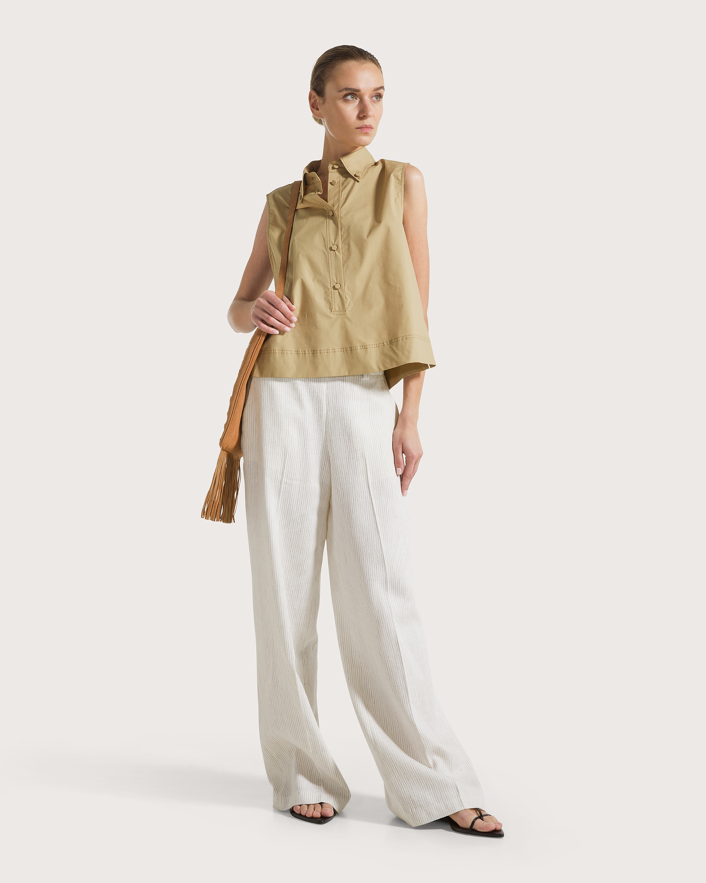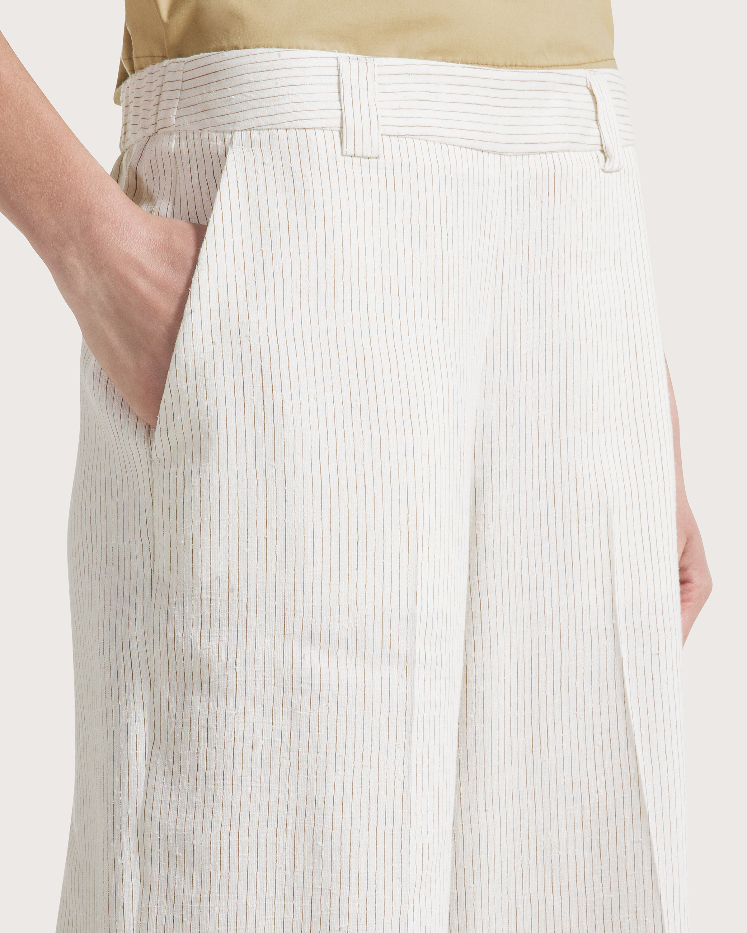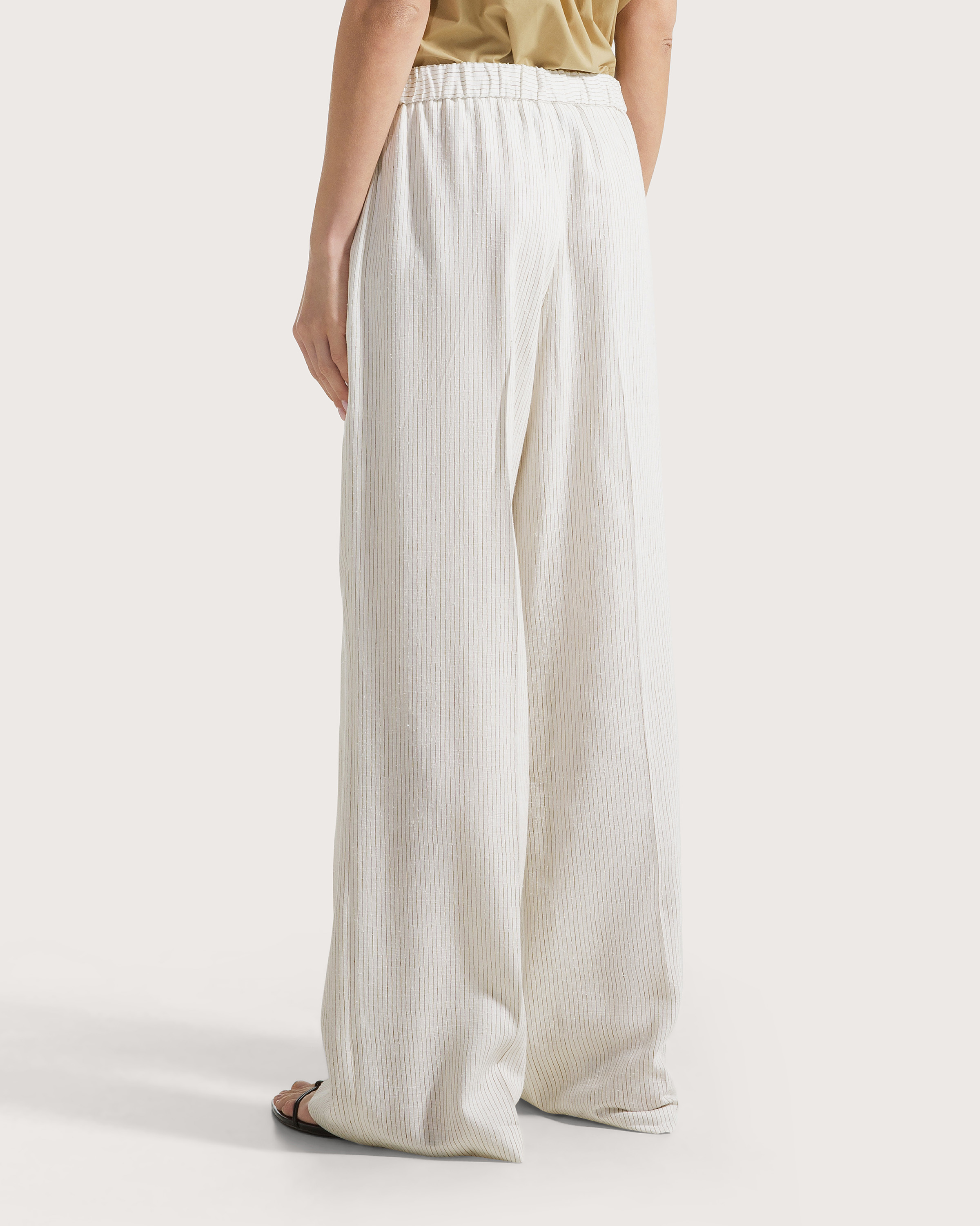Ľahké nohavice s voľnou, elegantne splývavou siluetou zaujmú jemnou vertikálnou textúrou, ktorá opticky predlžuje postavu. Svetlý prírodný odtieň pôsobí sviežo a nadčasovo, zatiaľ čo vzdušný materiál zaručuje maximálne pohodlie. Sofistikovaný kúsok ideálny pre letné outfity v uvoľnenom, elegantnom štýle. Zloženie: 52% Ľan 31% Viskóza 9% Polyamid 8% Hodváb