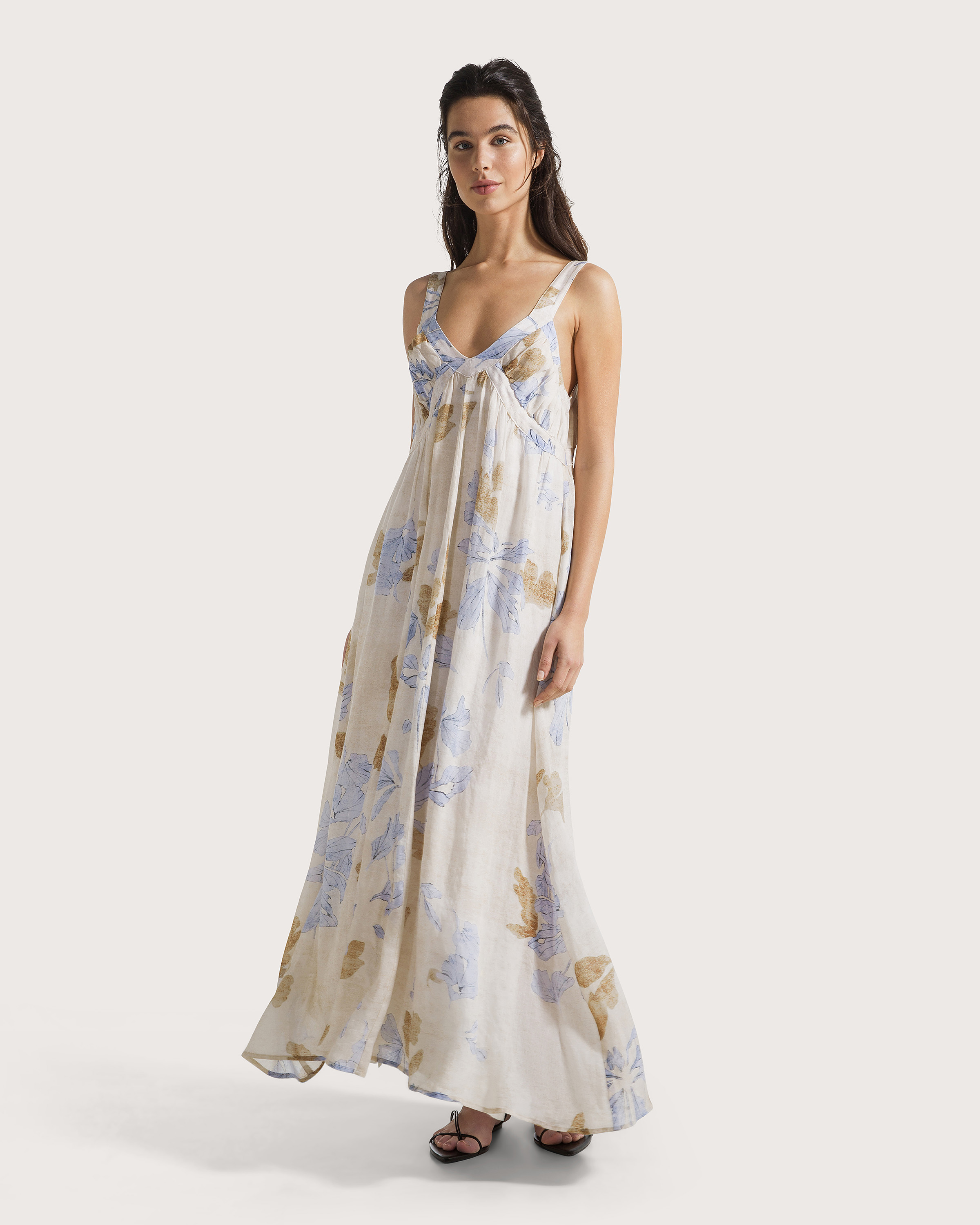 Maxi šaty z ľahkého, vzdušného materiálu s jemným kvetinovým vzorom v prirodzených tónoch. Hlbší výstrih a široké ramienka vytvárajú elegantnú siluetu, zatiaľ čo voľný, splývavý strih zabezpečuje maximálne pohodlie. Romantický model ideálny na letné dni, dovolenky aj nenútené elegantné príležitosti.